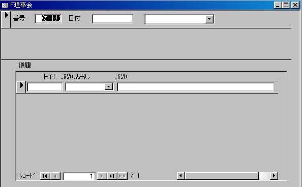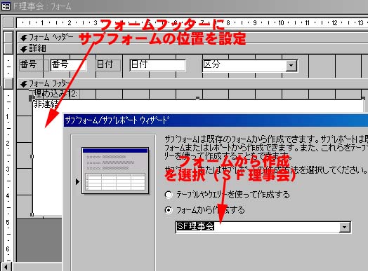 | まえのページで、サブフォームの作成と表題をつけましたが、やっていることはフォームの作成とかわりません。前回つくった、SF理事会を、F理事会に組み込むことによって、はじめてサブフォームとして機能するわけです。それでは、F理事会に、SF理事会を 組み込みましょう。 |