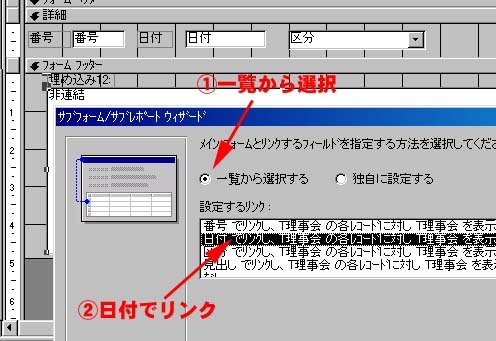 | F理事会をデザインビュウでひらき、フッターのスペースを広くとります。そして、ツールボックスの左の下から2番目にある サブフォーム/サブレポートを選択し、埋め込む位置を決めます。そして、ウイザードで、フォームから作成する を選択します。 |