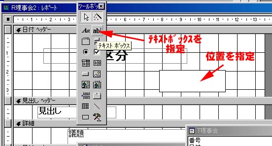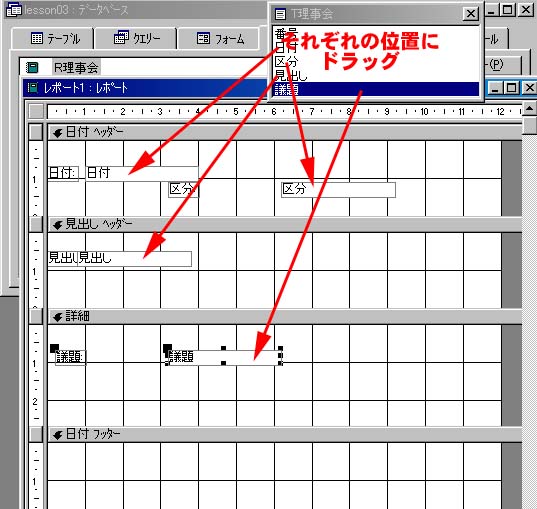 | ヘッダー等の設定ができたら、フィールドリストから、各フィールドをドラッグします。 |