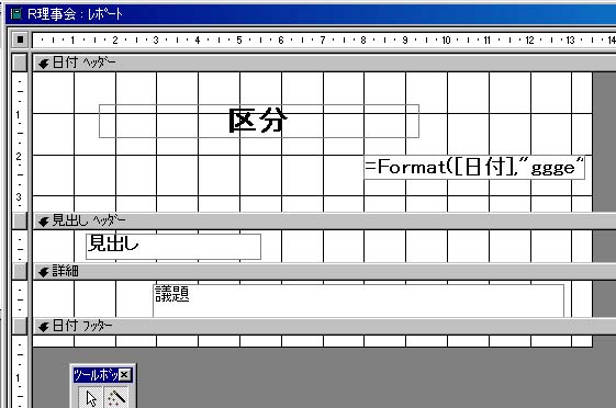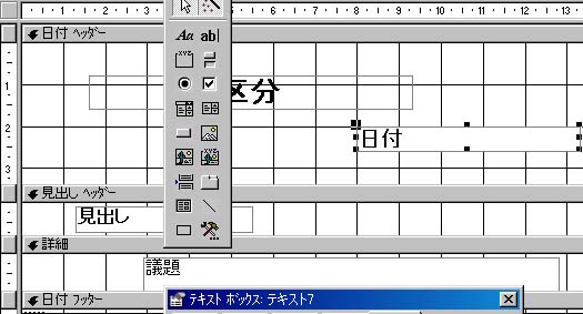 | 一応、これで、フォントサイズ等の調整がおわりました。印刷プレビューで確認しておきましょう。しかし、これでは、前回同様日付の表示が99/3/21といった表示になってしまいます。今回は、クエリーからでなく、レポート上で変更しましょう。 |