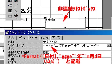 | 非連結のコントロールボックスのプロパティを指定し、前回と同じFormat関数を記載します。前回のファイルが手元にあるなら、クエリーをデザインビュウでひらき、コピーしてください。しかし、重要なことは、クエリーが「:」コロンと使うのに対して、レポートやフォームの場合は「=」イーコールを使う点です。 |
