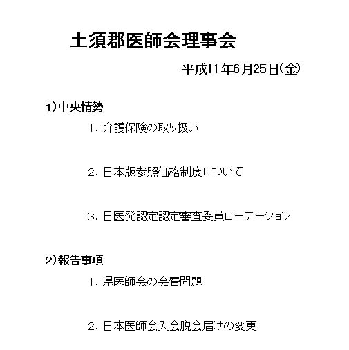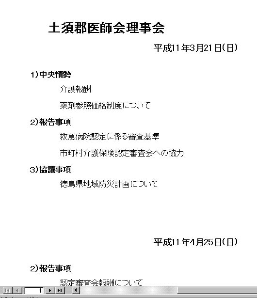 | これで完成です。ページセレクタを動かしてみて、なにも表示されないページある時は、レポートの横幅等を調整します。また、議題の項目が少なく、下の余白が大きすぎるときは、レポートの詳細 の高さを加減し、バランスのよいレイアウトにします。議題の内容を入力するとき、「1、介護保険の取り扱い 2、日本版参照価格制度 」といったように、数字を頭につけると、入力した順番に並べることができます。この効果をねらって、見出し、議題の並べ替えを 昇順 にしたわけです。また、前回の講演会の案内のように、フォームからレポートを呼び出すこともマクロを使えば簡単にできます。この場合は、日付でよびだすことになります。完成品を下に掲載しておきます。 |