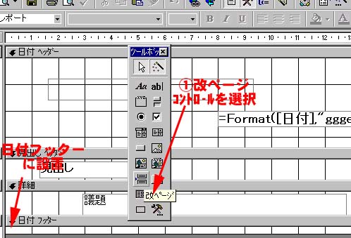 | ツールボックスから、改ページコントロールを選択。日付フッターにおきます。つまり、違う日付のデータきたところで、強制的にページを変えてしまおうというわけです。こうすれば、1日分のデータがB5一枚におさまりますね。 |